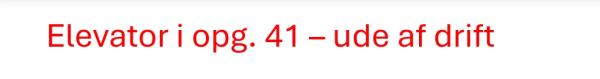 Opdatering 19-11-2025: Elevator i opg. 41-FORTSAT ude af drift